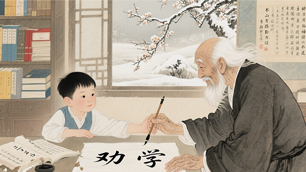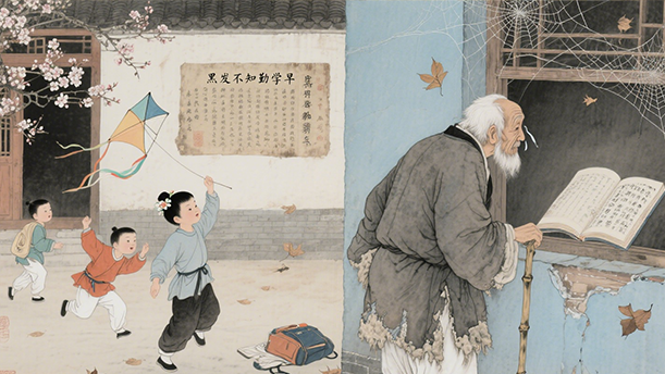 在朗诵时,对于前两句“三更灯火五更鸡,正是男儿读书时”,应以平稳、自然的语调去叙述,仿佛在娓娓道来一个平常却又意义深远的事实,让听众能清晰地感受到诗句中所描绘的那种勤奋学习的场景氛围。而后两句“黑发不知勤学早,白首方悔读书迟”,则要饱含深情,带着一种急切的劝勉之意。朗诵第三句“黑发不知勤学早”时,语速适当加快,以体现出时光匆匆、稍纵即逝的紧迫感,强调年少时不珍惜时光的疏忽。当读到最后一句“白首方悔读书迟”时,要放慢语速,声音低沉且有力,将那种到了年老之时才后悔没有早早勤奋学习的懊恼、遗憾之情,语重心长地表达出来,从而更能触动听众的心灵,引发他们对珍惜时光、勤奋学习的思考。