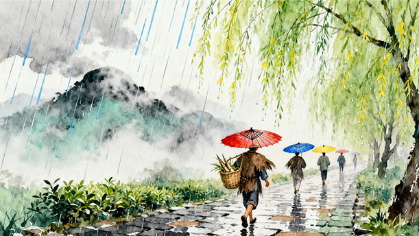 开篇“清明时节雨纷纷”,以极简的笔触勾勒清明时节的典型环境,瞬间奠定全诗的基调。“清明时节”点明时间,关联着扫墓祭祖、缅怀先人的传统习俗,自带一层肃穆的情感底色;“雨纷纷”则描摹天气——细密的春雨连绵不绝,如丝如缕,既写出春日降雨的特点,更以“纷纷”的朦胧感,渲染出凄迷、清冷的氛围。这一句没有直接写“愁”,却通过“雨纷纷”的环境,将清明时节的感伤情绪悄悄铺垫,仿佛能看见细雨中天地朦胧的景象,听见雨滴轻落的细微声响。朗诵时需带出这份“清冷感”,语调可稍缓,气息轻柔,让“雨纷纷”的朦胧与缠绵在声音中蔓延,传递出节气特有的静谧与感伤。