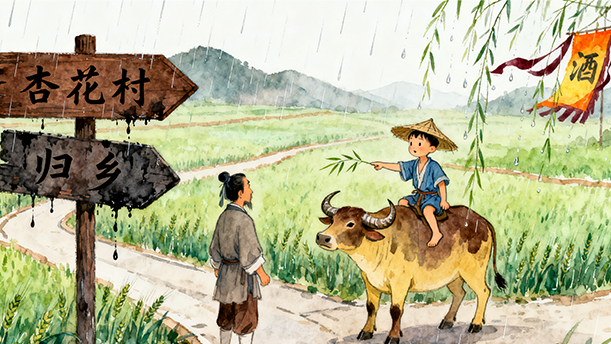 结尾“牧童遥指杏花村”,以牧童的“遥指”收束全诗,瞬间将前文的凄迷氛围转为明朗鲜活,如“柳暗花明又一村”般令人豁然开朗。“牧童”是天真烂漫的象征,他的出现打破了行人的孤寂,也为清冷的雨景注入一抹灵动;“遥指”是动态的指引,没有多余的话语,只用手势指向远方,既简洁又充满画面感——读者仿佛能看见牧童抬手指向远处,顺着他的手势望去,便是“杏花村”;“杏花村”则是意境的升华,“杏花”象征着春日的生机与美好,“村”代表着人间的烟火气,远处杏花盛开、酒旗飘摇的村庄,不仅是酒家的所在,更成了行人愁绪的慰藉、旅途的归宿。朗诵时需转换语调,从之前的沉缓转为轻快明朗,“遥指”二字可稍作延长,带着对“杏花村”的向往,让声音中透出“豁然开朗”的暖意,留下“言有尽而意无穷”的余味——行人是否找到酒家?杏花村的春光如何?这些留白让读者自行想象,更添诗歌的韵味。