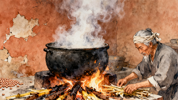开篇“煮豆燃豆萁,豆在釜中泣”,以精妙的比喻切入,瞬间将兄弟相残的本质具象化。“豆”与“萁”本同生于一根(豆植株),“萁”是豆的茎秆,如今却被用来燃烧煮“豆”,这种“以同根之物害同根之体”的场景,恰是曹植与曹丕“兄弟相煎”的隐喻——曹丕为巩固权力欲迫害曹植,正如“燃萁煮豆”般,以手足之亲行加害之事。“豆在釜中泣”一句,更是将“豆”拟人化,赋予其人类的情感:锅中的豆子仿佛在哭泣,既是为自身将被煮烂的命运悲泣,更是为“萁”与“豆”本是同根却自相残杀的荒诞而悲泣。朗诵时需奠定“沉郁”的基调,“泣”字可稍作重读,语调低沉,气息滞缓,仿佛能听见豆子微弱的呜咽,传递出曹植对“兄弟相害”的痛心与自身如“釜中豆”般的绝望。