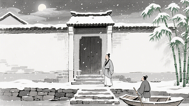 山阴雪夜,王子猷醒来见雪景皎洁,命酒吟诗,忽忆戴逵居剡县,遂连夜乘舟前往。经一夜航程至戴家门