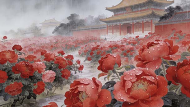 后两句转写景:“野径云俱黑,江船火独明”,雨夜的黑与船火的亮相衬,是春夜雨中的幽寂,却让人觉出安稳;末句“晓看红湿处,花重锦官城”,从当下的雨跳到清晨的想象——带雨的花沉甸甸地铺满成都,把“喜”从当下的轻喜,延成了对生机的热切期待。整首诗没有直白说“喜”,却从雨的灵性、雨夜的静美到晨景的憧憬,把对春雨的偏爱揉进每一处细节,清淡却满是诗意。