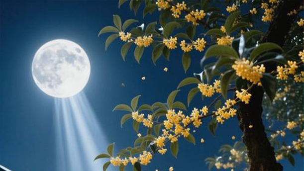 第二句“殿前拾得露华新”,把笔触从半空落回到诗人自己的行动:诗人行至天竺寺的殿前,恰好接住了飘落的桂花,指尖触到花瓣时,还能摸到桂花上沾着的清亮露水,带着夜晚的清凉湿气,一个“新”字写活了桂花带露的鲜活感,也把诗人拾花时那种意外又欣喜的情态藏在了字里。后两句从眼前实景转向了悠悠遐思,“至今不会天中事”是诗人的自言自语,捧着带着清露的桂花,看着天上圆满的明月,诗人忍不住心生怅惘,凡间之人终究猜不透天宫里的种种故事,说不清这桂花是不是真的从月宫里的桂树上飘落下来。最后一句“应是嫦娥掷与人”给这份遐思给出了一个温柔浪漫的回答,这带着露华的桂花呀,想来不是寻常飘落,应该是月宫里的嫦娥特意从云中掷给人间的礼物吧。