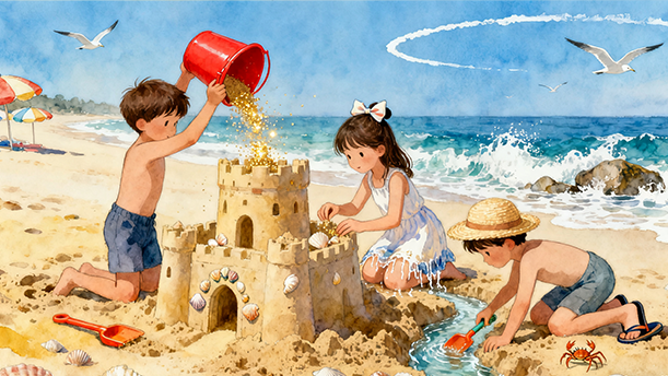 我们在沙堆上垒起城堡,城堡周围筑起围墙,围墙外再插上干树枝——那是我们的树。不知谁说了一句:“这城堡里住着一个凶狠的魔王。”接着又有人补充:“他抢去了美丽的公主!”第三个小伙伴说:“你们快听,公主在城堡里哭呢!”就这样,我们编织着童话。