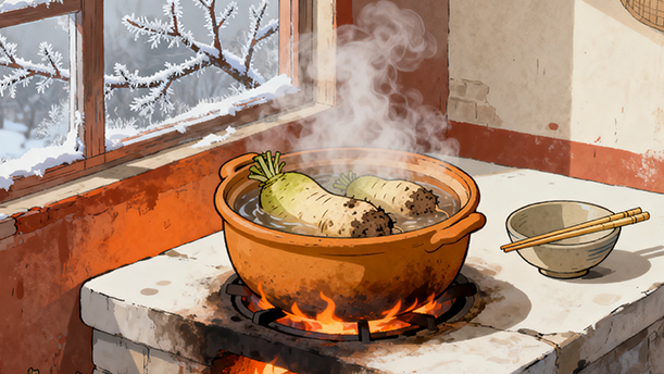 萝卜当然也是一种菜根。有一个新鲜的早晨,在卖菜的吆喝声中,起身披衣出房,看见桌上放着一碗雪白的热气腾腾的粥,粥碗前是一盘腌菜,有长条的青黄色的豇豆,有灯笼形的通红的辣椒,还有萝卜,米白色而圆滑,有如一些煮熟了的鸡蛋。这与范文正的淡黄商差得多远!我相信那个说咬得菜根百事可作的老祖宗,要是看见了这样的一顿早饭,决定会摇他那白发之头的。