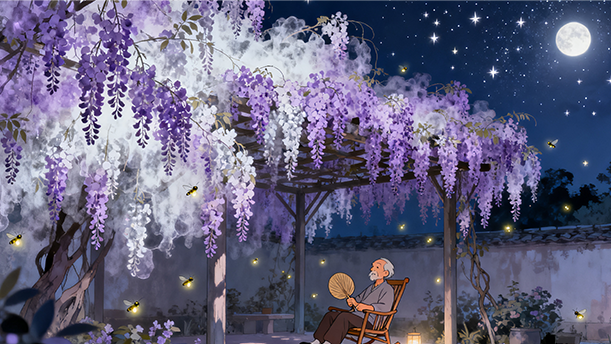 从未见过开得这样盛的藤萝,只见一片辉煌的淡紫色,像一条瀑布,从空中垂下,不见其发端,也不见其终极,只是深深浅浅的紫,仿佛在流动,在欢笑,在不停地生长。紫色的大条幅上,泛着点点银光,就像迸溅的水花。仔细看时,才知那是每一朵紫花中的最浅淡的部分,在和阳光互相挑逗。