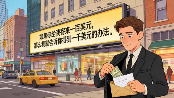 在美国某城市的大街上贴着一张广告:“ 如果你给我寄来一百美元 ,那么我就告 诉你得到一千美元的办法 。 ”