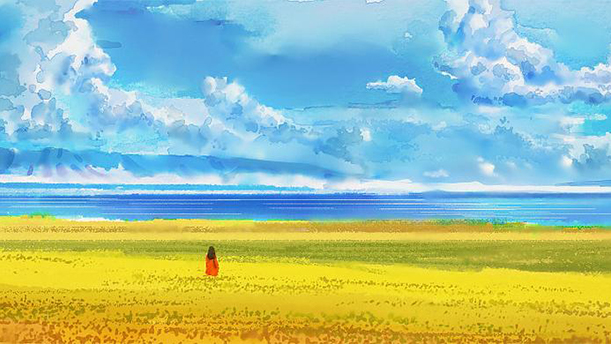 我扑向七月的清晨,深深地呼吸着雨后甜润的空气。 瞬 (shùn) 间,我惊住了,像是无意中扑进一 幅巨大的 画卷。我的眼前是一片镶着露珠的绿茵茵的草滩,草滩上生长着一垄垄黄灿灿的油菜花,这绿色和黄色的背后,衔(xián)接着无边无际的蓝色的水。它蓝似海洋,可比海 洋要蓝得纯正;它蓝似天空,可比天空要蓝得深沉。青海 湖的蓝,蓝得净,蓝得深湛(zhàn), 也蓝得温柔恬 (tián)雅,那蓝锦缎似的湖面上,起伏着一层微微的涟漪 (liányī), 像是小姑娘那水灵灵、蓝晶晶的眸(móu)子。