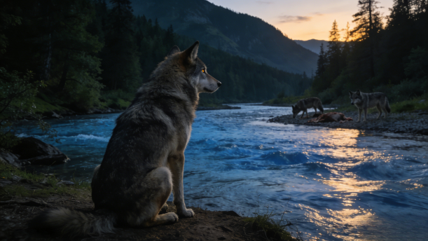 而当我独自沿着这条河,巡查我们这个狼群的领地时,我便会停下匆忙的脚步,久久地蹲坐在岸上,看它无羁无绊、浩浩荡荡潇洒地远去,总觉得它会把我那些颠三倒四、不是一只狼所应该有的思绪带走,带走……