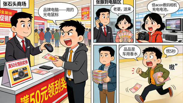 销售员连忙说:“那你买啊,现在正是时机,买了电脑还有机会摸奖。再说你已经有了一个鼠标,不买电脑就浪费了,我们可以给你免掉鼠标的钱。”