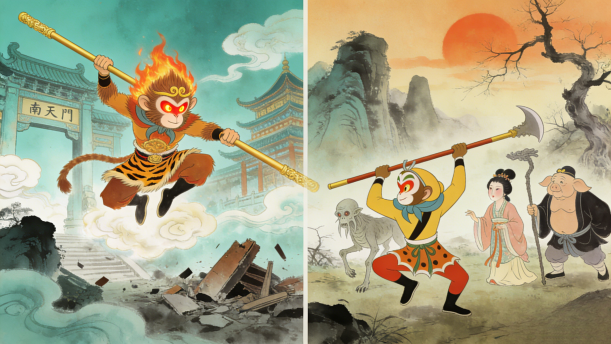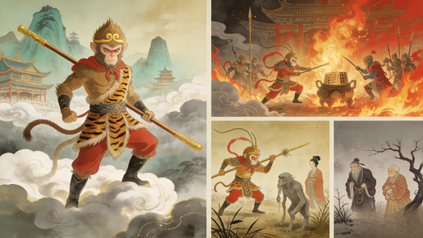 在我国古代名著《西游记》中,有众多的妖魔鬼怪,也有性格鲜明的唐僧师徒四人,但让我印象最深的就是斩妖除魔、聪明伶俐的孙悟空。孙悟空,字行者,大名鼎鼎,有“美猴王”“齐天大圣”等称号,他身穿一身黄布装,头戴一顶佛帽,手持一根让妖魔鬼怪闻风丧胆的如意金箍棒。他的身世来历更为奇妙,他是一只从受日精月华的仙石中蹦出来的石猴,经菩提老祖点化后变成一个上天入地无所不能的“仙”猴,还会七十二变、筋斗云和火眼金睛等法术,可以说没有孙悟空唐僧就取不到真经。就因孙悟空大闹天宫,损伤无数天兵天将,被如来佛祖压在五指山下500年。后来经观音的教导,变成了唐僧的大徒弟,保护唐僧西天取经,曾多次把唐僧从妖怪的血口中挽救回来。