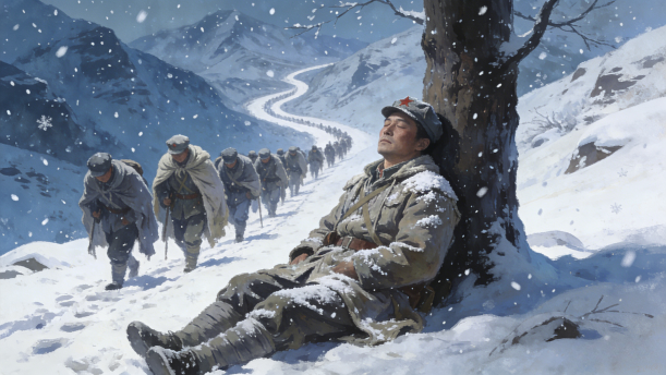 红军队伍在冰天雪地里艰难地前进。严寒把云中山冻成了一个大冰坨。狂风呼啸,大雪纷飞,似乎要吞掉这支装备很差的队伍。将军早把他的马让给了重伤员。他率领战士们向前挺进,在冰雪中为后续部队开辟一条通路。等待他们的是恶劣的环境和残酷的战斗,可能吃不上饭,可能睡雪窝,可能一天要走一百几十里路,可能遭到敌人的突然袭击。这支队伍能不能经受住这样严峻的考验呢?将军思索着。
