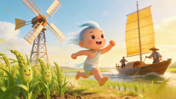 风娃娃长大了,风妈妈说:“到田野上去吧,到那里,你可以帮助人们做许多好事。”