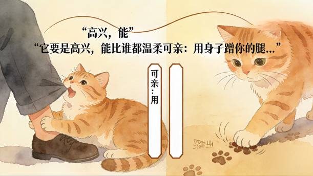 它要是高兴,能比谁都温柔可亲:用身子蹭你的腿,把脖子伸出来让你给它抓痒,或是在你写作的时候,跳上桌来,在稿纸上踩印几朵小梅花。它还会丰富多腔地叫唤,长短不同,粗细各异,变化多端。在不叫的时候,它还会咕噜咕噜地给自己解闷。这可都凭它的高兴。它若是不高兴啊,无论谁说多少好话,它也一声不出。