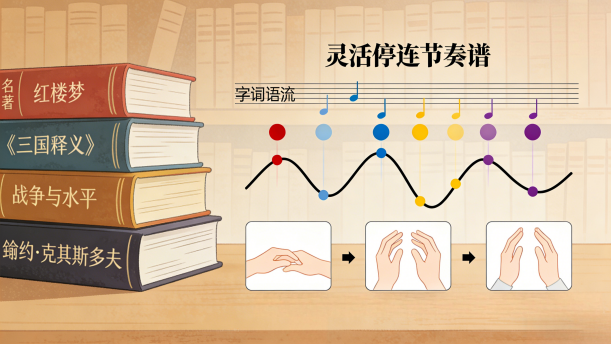 任何停顿和连读都不可以是呆板的、生硬的,无论是停顿的位置还是时间,都没有万能的公式。有声语言艺术的生命力在于“变化”。因此,我们应该在停连处理上保持较大的灵活性,即做到灵活性停连。