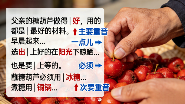 本文要着重体现的是父亲对于制作糖葫芦这门手艺的精益求精。第一段的大意是父亲对于制作糖葫芦的材料非常讲究。注意,要突出的不是材料本身,而是材料的质量,如“好”“最好的材料”“一点儿”“上好的”“上等的”“冰糖”“铜锅”等,整个段落中,这些词是能够凸显“讲究”的,应作重音处理,而这些重音也分主要与次要,第一个“好”体现了女孩内心的骄傲感,也引出后文“为什么好”,这才是主要重音。“最好的材料”也是重音,但父亲的糖葫芦做得好,材料好只是其中一个因素,还有别的因素,因此,别的因素可以作次要重音处理。