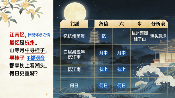 运用备稿六步来把握这首诗,由于诗文语言本身很精练,所以重音的选择更需谨慎。在明确主题、背景、目的的基础上才能更加准确地把握哪些词或词组是重音。