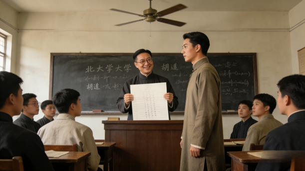 三十年代初,胡适在北京大学任教授。讲课时他常常对白话文大加称赞,引起一些只喜欢文言文而不喜欢白话文的学生的不满。