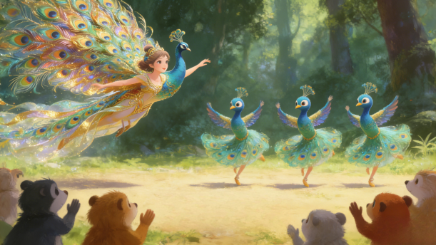 孔雀仙子(飞出)说:“美不美,不能光凭自个儿说,要请大伙儿来评!”