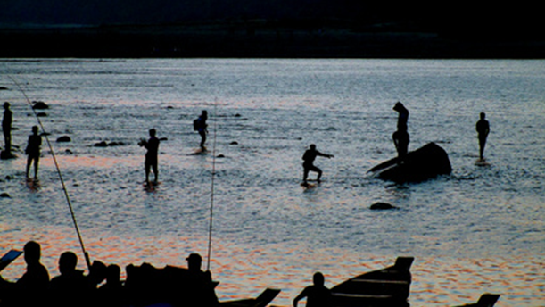老渔民说完话,不等姑娘们搭言,早回到船上,大声说笑着,动手收拾着满船烂银也似的新鲜鱼儿。