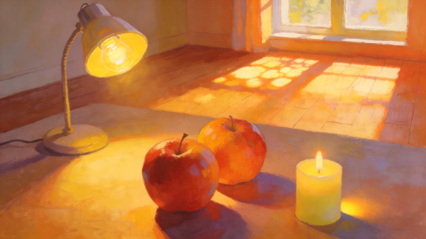 每种光都有各自的色彩特征,如阳光在早晨、中午、傍晚的色彩各不相同;灯光中荧光灯、白炽灯、霓虹灯,火光中炉火光、烛光等的色彩也不一样。