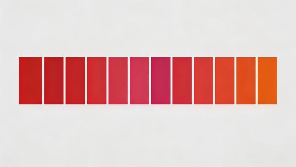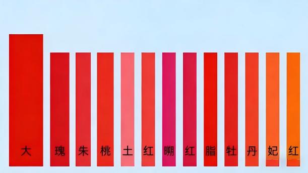上面11幅图的颜色从左到右分别是大红、玫瑰红、朱红、桃红、土红、洋红、曙红、胭脂红、牡丹红、妃红、橙红,学生要能清楚地认识这些红色。