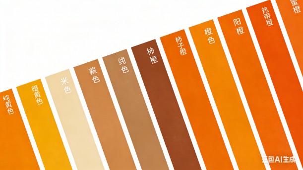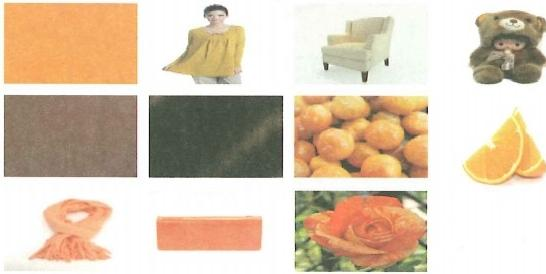 1.上面11幅图的颜色从左到右分别是橘黄色、暗黄色、米色、赭色、浅棕色、棕色、柿子橙、橙、阳橙、热带橙、蜜橙。学生要能清楚地认识这些橙色。