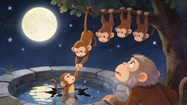猴子们爬上了井旁边的大树。老猴子倒挂在树上,拉住大猴子的脚。大猴子也倒挂着,拉住另一只猴子的脚。猴子们就这样一只接一只,一直挂到井里头,小猴子挂在最下边。