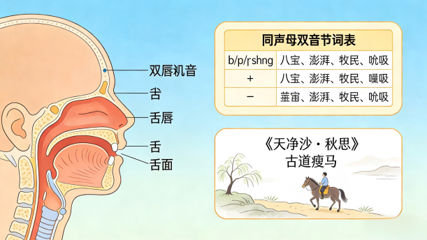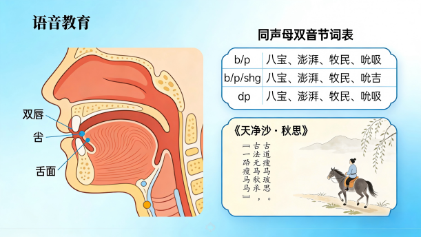 同声母双音节词语练习主要针对音节的出字阶段,同一声母和不同韵母拼合时,注意发音器官,如双唇、上齿、下齿、硬腭、舌头(舌尖、舌面、舌根)之间的配合。