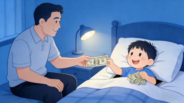 “哦,”小孩低下头,接着说,“爸,可以借我十美金吗?”父亲发怒:“若借钱买无意义玩具,回房间睡觉,想想为何如此自私,我每天辛苦工作,没时间玩你的游戏。”小孩默默回房关门。父亲平静后,觉得可能对孩子太凶,或许孩子真想买东西且平时很少要钱。父亲进孩子房间问:“你睡了吗?”“爸,还没,我醒着。”孩子答。“我刚才可能对你太凶,”父亲说,“我不该发那么大火,这是你要的十美金。”“爸,谢谢您。”孩子高兴地从枕头下拿出皱钞票数。“你已有钱为何还要?”父亲不解。“因原来不够,现在凑够了。”孩子答,“爸,我现在有二十美金,可以向您买一小时时间吗?明天请早回家,我想和您一起吃晚餐。”