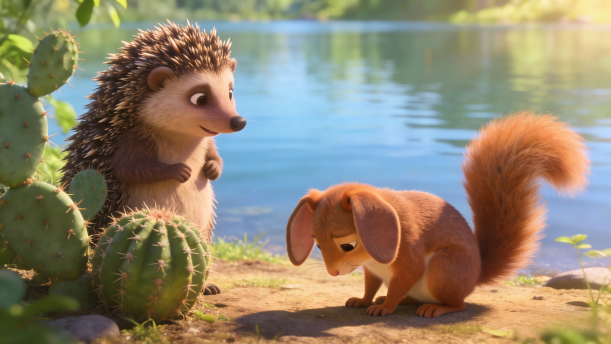 “天哪,我可怜的孩子们!”刺猬妈妈一面哭,一面快步跑到湖边。她定睛一看,原来是一个个仙人球,哪儿是小刺猬呀!她回来对松鼠说:“你又看错了,那是仙人球,不是我的孩子。”