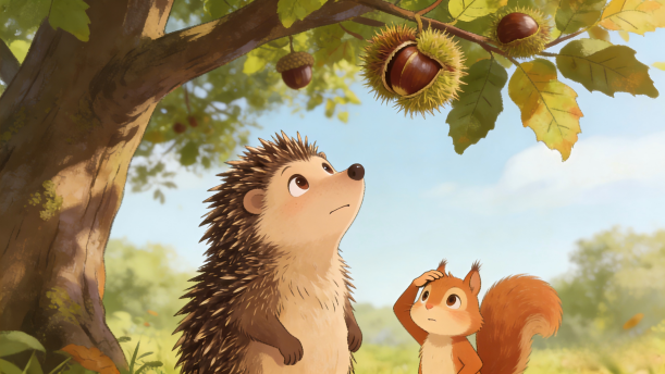 “哎呀!我的天哪!”刺猬妈妈一边哭,一边往山上跑。她来到那棵大树前一看,原来树上挂的是一只只毛栗子。刺猬妈妈对小松鼠说:“你看错了,那是毛栗子,不是我的孩子。请你再去帮我找找吧!”