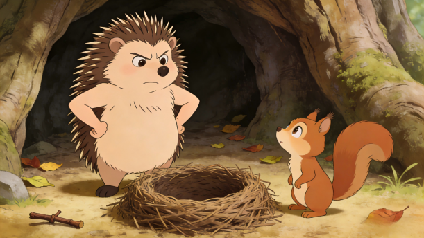 刺猬妈妈找食回来,见窝里的小刺猬都不见了,急得她坐立不安,忙请小松鼠去帮她寻找。
