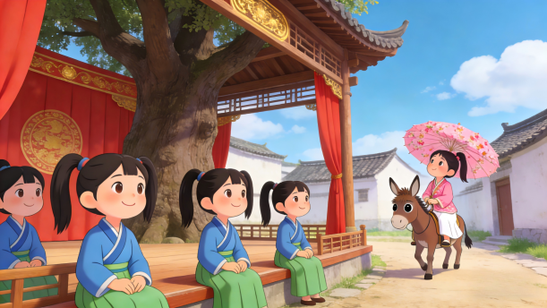 槐树槐,槐树槐,槐树底下好戏台;人家的姑娘都来了,我家的姑娘还没来;说着说着就来了,骑着驴,打着伞,歪着脑袋上戏台。