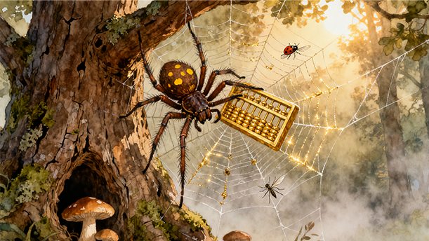 老蜘蛛爬爬先生有个金算盘,他能算出织一张网需要用多少线。爬爬织的网既经济又结实,森林里所有的动物都说爬爬是个能干的蜘蛛。