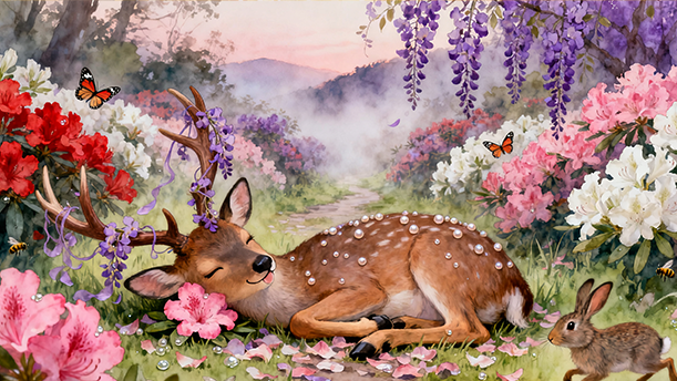 小黄麂懒洋洋地离开了大“酒缸”。太阳暖融融地抚摸着小黄麂,小黄麂突然感到有一种踩在棉花上的感觉,天上的云彩也模糊了,都成了一片热烘烘的玫瑰色。它不想走路,躺下去,枕着花瓣,睡了个甜觉。