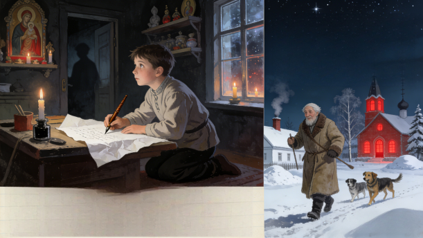 九岁的凡卡·茹科夫,三个月前给送到鞋匠阿里亚希涅那儿做学徒。圣诞节前夜,他没躺下睡觉。等老板、老板娘和几个伙计到教堂做礼拜去了,就从老板的立柜里拿出一小瓶墨水,一支笔尖生了锈的钢笔,摩平一张揉皱了的白纸,写起信来。