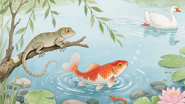 小壁虎爬呀爬,爬到小河边。他看见小鱼摇着尾巴。小壁虎说: "小鱼姐姐,您把尾巴借给我行吗?”小鱼说:“不行啊,我要用尾巴拨水呢。”