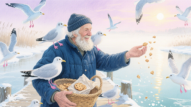 朋友告诉我,十多年了,一到冬天,老人每天必来,和海鸥就像亲人一样。