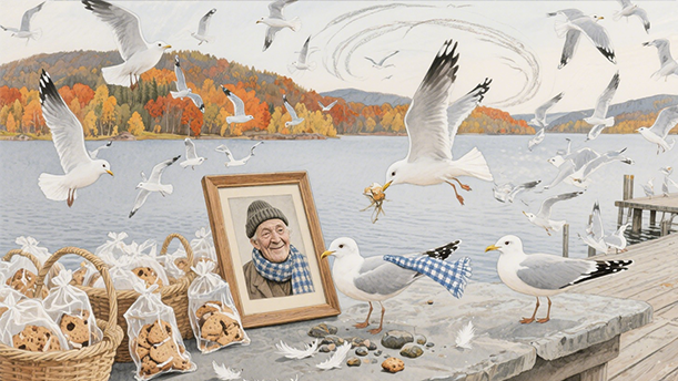 海鸥们急速扇动翅膀,轮流飞到老人遗像前的空中,像是前未瞻仰遗容的亲属。照片上的老人默默地注视着周围盘旋翻飞的海鸥们,注视着与他相伴了多个冬天的“儿女”们……过了一会儿,每鸥纷纷落地,竟在老人遗像前后站成了两行。它们肃立不动,像是为老人守灵的白翼天使。