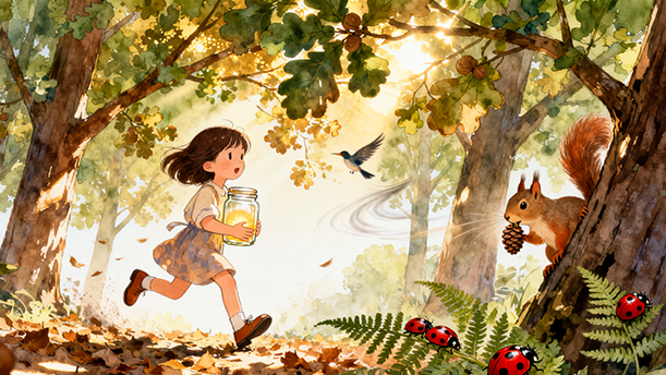 鹿儿跳啊蹦啊,乌黑的头发在阳光下闪闪发亮。她索性伸出双脚坐在了草地上。小小的围裙里充满了阳光。看到了可爱的阳光,鹿儿心里油然升起了一个美好的想法:“啊!多好的阳光啊,我要把它带回去,作为礼物送给我的奶奶。”