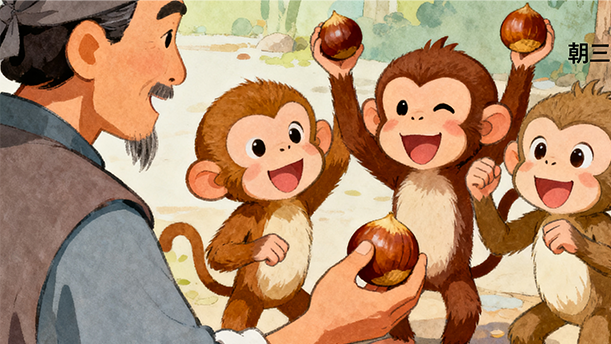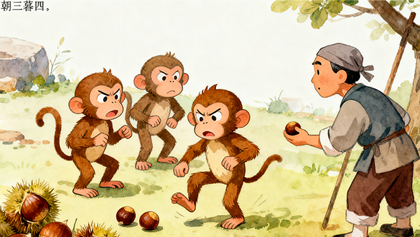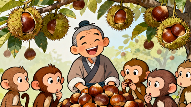 战国时代,宋国有一个养猴子的老人,他在家中的院子里养了许多猴子。日子一久,这个老人和猴子竟然能沟通讲话了。这个老人每天早晚都分别给每只猴子四颗栗子。