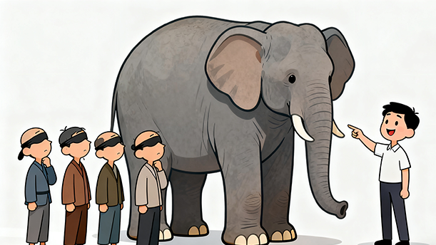 过了好一会儿,他们都摸得差不多了。国王问道:“现在你们明白大象是什么样子的了吗?”瞎子们齐声回答:“明白了!”国王说:“那你们都说说看。”
