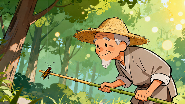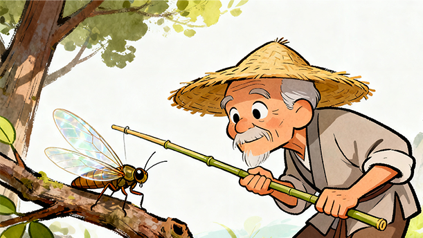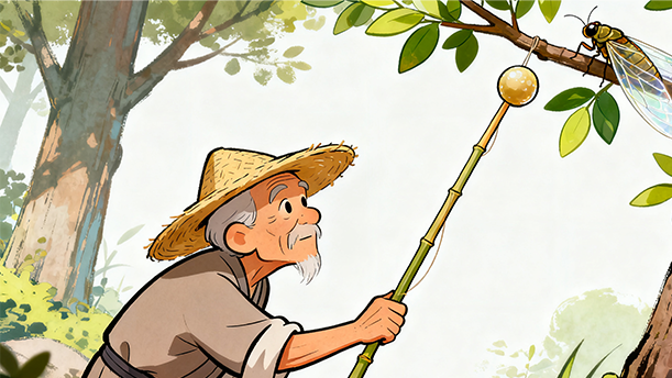 “方法肯定是有的,我练捕蝉五六个月后,在竿上垒放两粒粘丸而不掉下,蝉便很少有逃脱的。如垒三粒粘丸仍不落地,蝉十有八九会被捕住;如能将五粒粘丸垒在竹竿上,捕蝉就会像在地上拾东西一样简单容易了。”捕蝉翁说到此处捋捋胡须,严肃地对孔子的学生们传授经验。