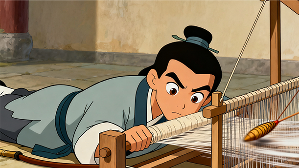 纪昌回到家里,就仰面躺在他妻子的织布机下,两眼死死盯住一上一下快速移动的机件。两年以后,即便拿着针朝他的眼睛刺去,他也能一眨不眨了。