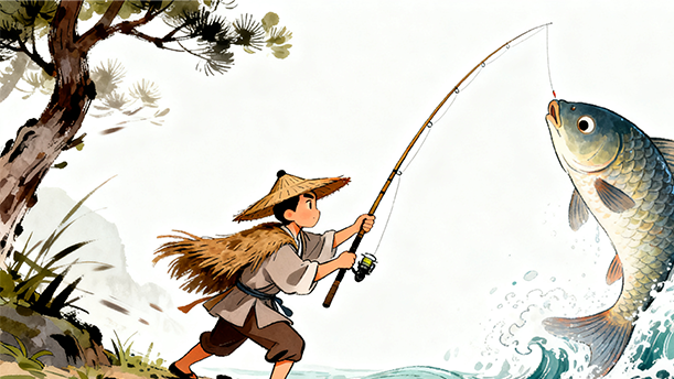 又过了一段时间,突然有一天,一条大鱼游过来,一口吞下了钓饵。这条大鱼即刻牵着鱼钩一头沉入水底,它咬住大鱼钩只疼得狂跳乱奔,一会儿钻出水面,一会儿沉入水底。