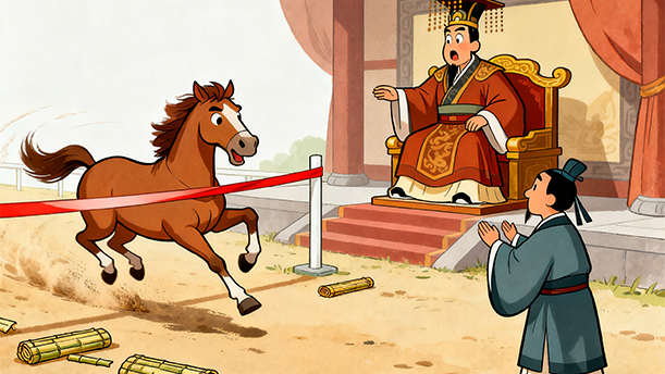 又一次赛马开始了。孙膑坐在赛马场边上,很有兴趣地看田忌与齐威王赛马。第一局,齐威王牵出自己的上马,田忌也牵出了自己的上马,结果跑下来,田忌的马稍逊一筹。第二局,齐威王牵出了中马,田忌也以自己的中马与之相对。第二局跑完,田忌的中马也慢了几步而落后。第三局,两边都以下马参赛,田忌的下马又未能跑赢齐威王的马。