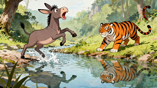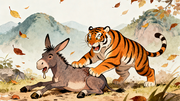 有一天,老虎正慢慢地接近驴,驴忽然长叫了一声,声音十分响亮。老虎吓了一跳,以为驴想吃掉它,回头转身就跑。跑到较远的地方,老虎又仔仔细细地观察了驴一番,觉得它似乎没什么特别厉害的本领。