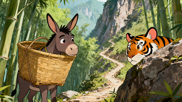 一只老虎出来觅食,远远地望见了这头驴。老虎从来没有见过驴,看到这家伙身躯庞大,耳朵长长的,脚上没有爪,样子挺吓人的。老虎有点害怕。在心里琢磨:妈呀!什么时候跑出这么个怪物来了,看上去似乎不太好惹。还是不要贸然行事,观察一下再说吧。