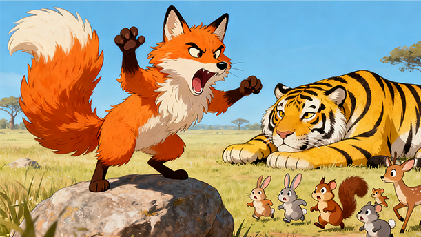 而狐狸呢,它心里清楚得很,这一切不过是自己编造的谎言罢了。但它却享受着这种被“百兽敬仰”的感觉,走起路来更加趾高气扬,仿佛自己真的成了这片森林的主宰。它偶尔回头,用那双狡黠的眼睛瞥向老虎,嘴角挂着一丝不易察觉的微笑,似乎在得意于自己的聪明才智。